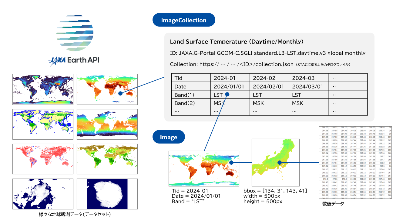 JAXA Earth API for JavaScript では、それらの各データセットに対応するものをImageCollectionオブジェクトと呼んでいます。
