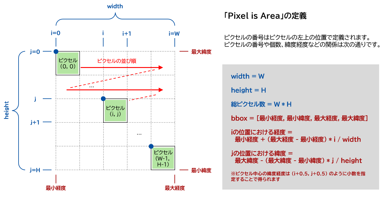 JAXA Earth API ではピクセルの位置の定義で「Pixel is Area」を採用しています。 ピクセルの番号は、ピクセルの左上の位置で定義されています。 ピクセルは左上から右上へとi方向、上から下へとj方向に順番に並んでいます。