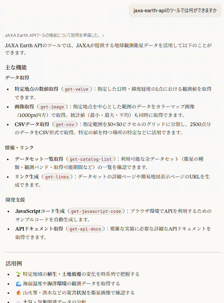 JAXA Earth API for JavaScript を使うと生成AIと連携するためのMCP (Model Context Protocol)の開発も可能です。 このチュートリアルではStreamable HTTP方式で、より実用的に使えるMCPを作ります。