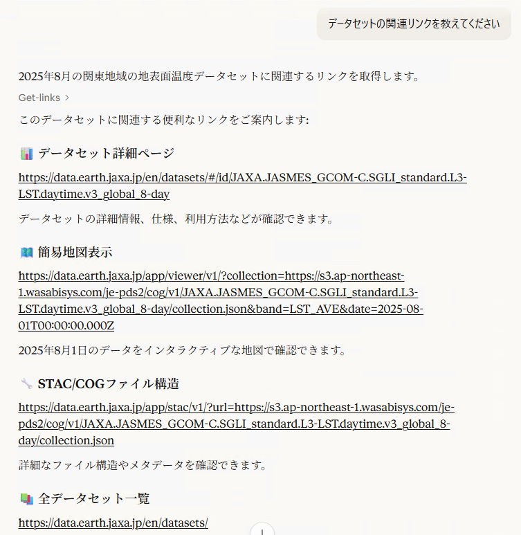 以上の機能を駆使することで、生成AIが必要なデータセットを選択し、値や画像を取得したり、詳細ページへの案内をすることが可能になります。 データを表示させるウェブページを生成することもできます。